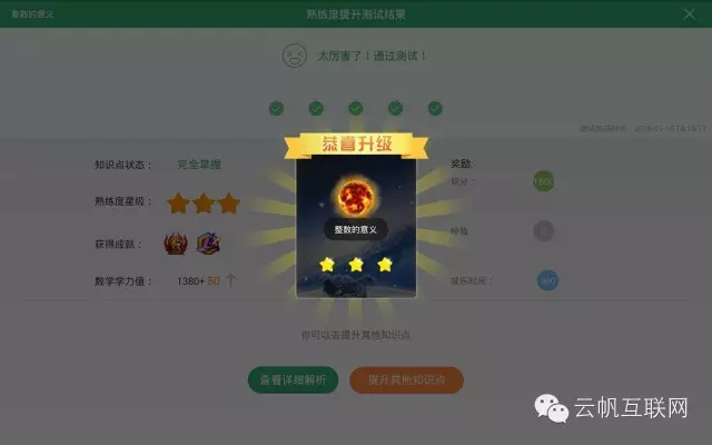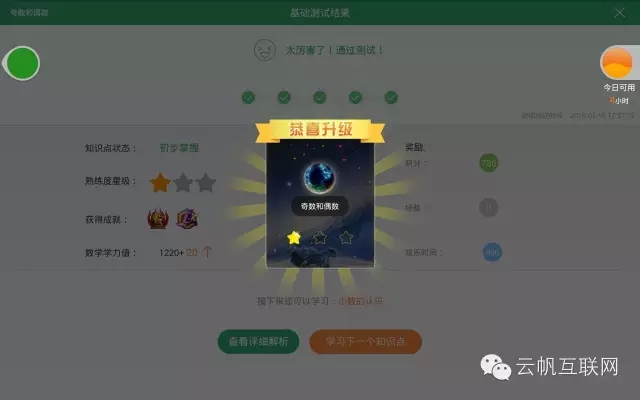 在同學(xué)覺得掌握了知識(shí)點(diǎn)后,可以進(jìn)行基礎(chǔ)測試,測試通過的要求是連續(xù)做對五道題目。通過測試后就會(huì)出現(xiàn)獎(jiǎng)勵(lì)和成就。每個(gè)知識(shí)點(diǎn)的熟練度有三顆星的等級(jí),每通過一次基礎(chǔ)測試會(huì)獲得一顆星。另外還有個(gè)成就系統(tǒng),就是在下圖背景中兩枚徽章的地方,同學(xué)只有在測試時(shí)一道題不錯(cuò)完成測試才能夠拿到兩枚徽章,這就是游戲化的嘗試: