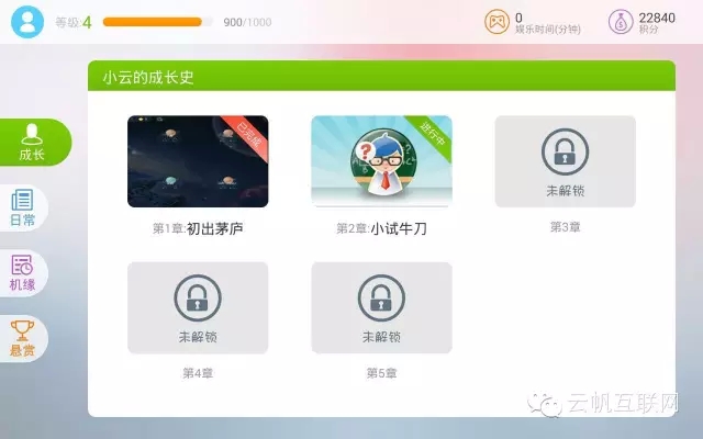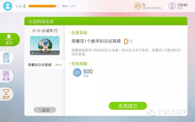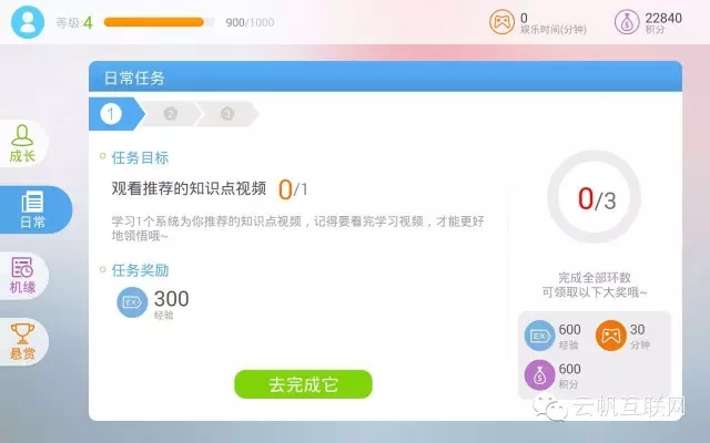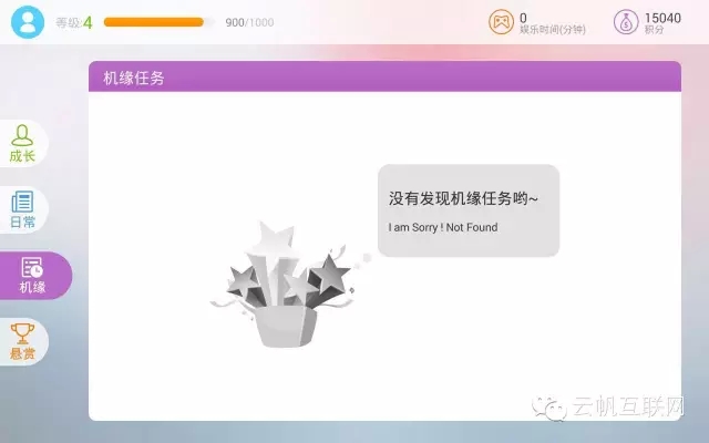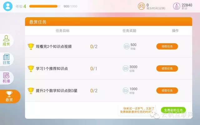 這又是一個(gè)典型的游戲元素的應(yīng)用。目標(biāo)同樣是給用戶以目標(biāo)并提供相應(yīng)的獎(jiǎng)勵(lì)。這里分為了成長任務(wù),日常任務(wù),機(jī)緣任務(wù)和懸賞任務(wù)。任務(wù)的獎(jiǎng)勵(lì)包括:經(jīng)驗(yàn)值(用來提升用戶等級(jí)),游戲模式的時(shí)間以及積分(積分應(yīng)該以后可以用來兌換一些獎(jiǎng)勵(lì))。