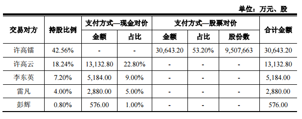 文化長(zhǎng)城在公告中稱,此次交易采用發(fā)行股份及支付現(xiàn)金方式,向許高鐳、許高云、雷凡、李東英、彭輝、商融投資6名股東購(gòu)買其持有的聯(lián)汛教育80%股權(quán),其中,40%的交易金額2.20億元以現(xiàn)金方式支付,60%的交易金額3.46億元以發(fā)行股份的方式支付。具體情況如下: