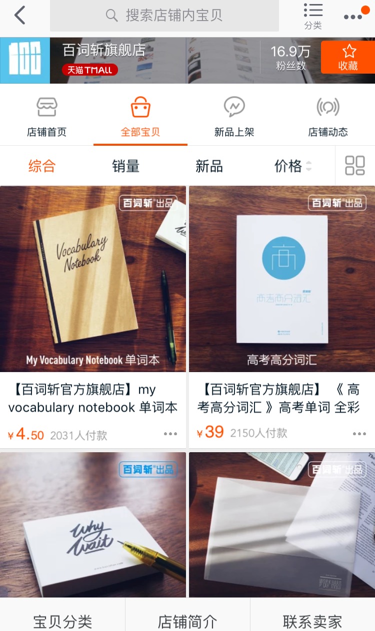 打開(kāi)百詞斬官網(wǎng),點(diǎn)擊“商店”,就可以打開(kāi)百詞斬的天貓旗艦店,目前,百詞斬天貓旗艦店有單詞書(shū)系列、原創(chuàng)周邊系列和兒童系列三個(gè)系列。
