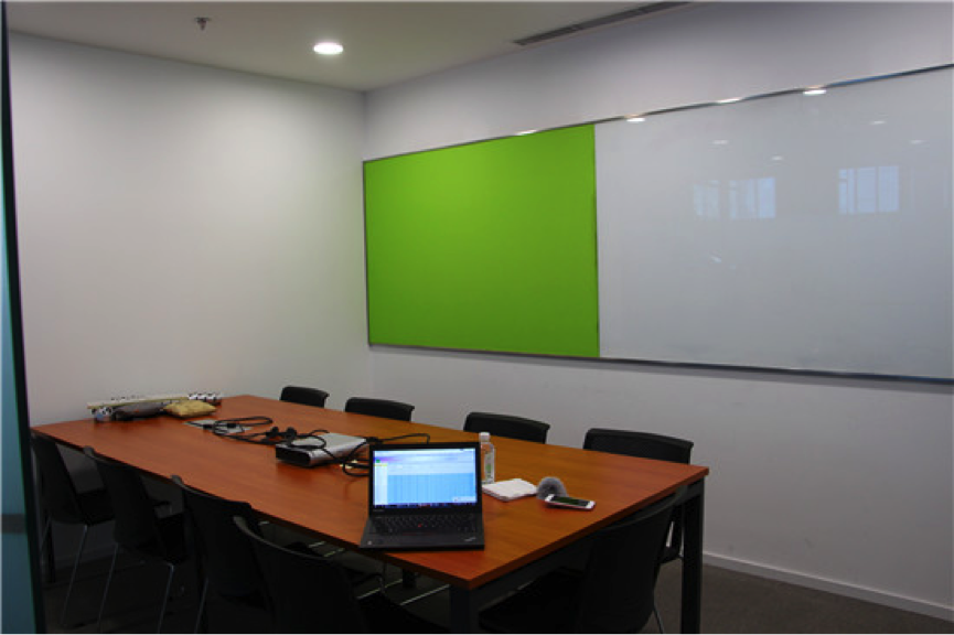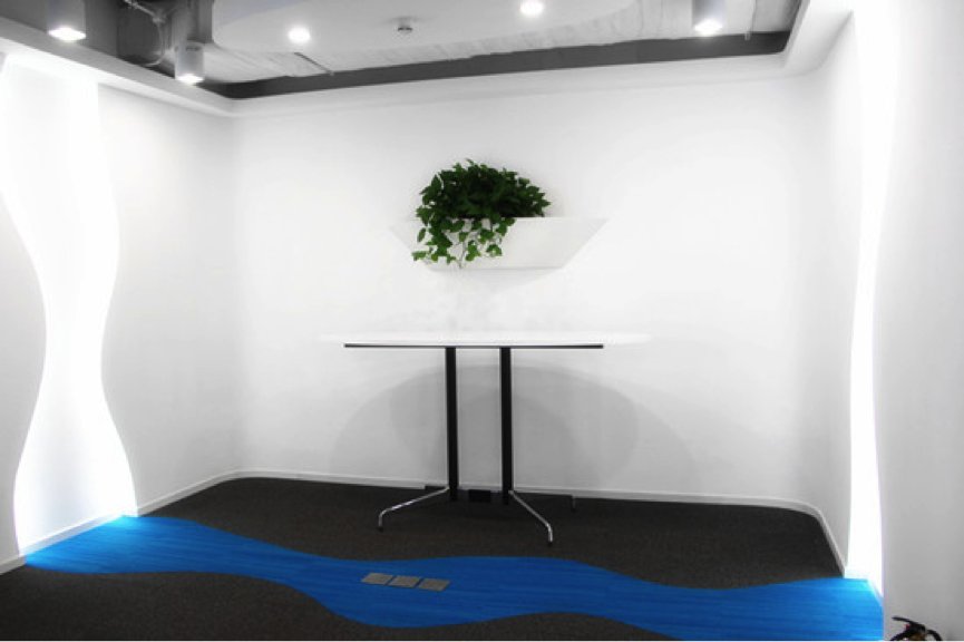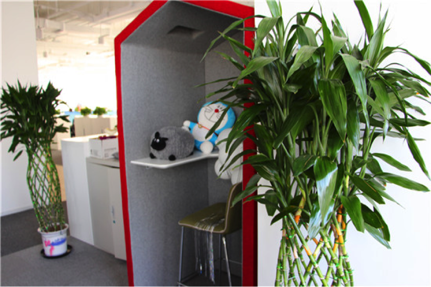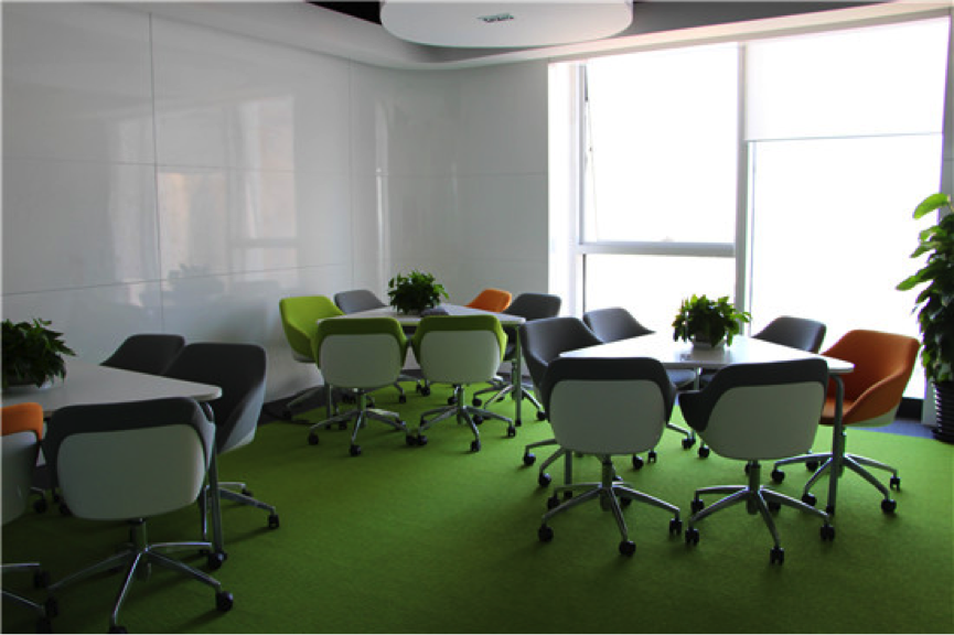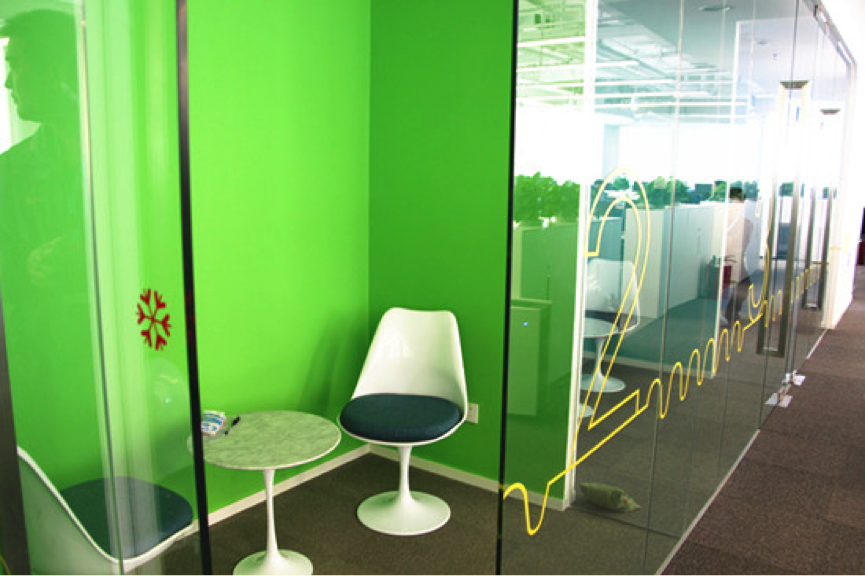 一進入主辦公區(qū),靠右的一側設有一列玻璃間,墻面藍色綠色為主,玻璃具有很好的隔音效果,市場部可以在里面談業(yè)務,其他員工也可以在里面接打電話,既保護個人隱私不尷尬,又不妨礙其他員工工作,兩全其美。
