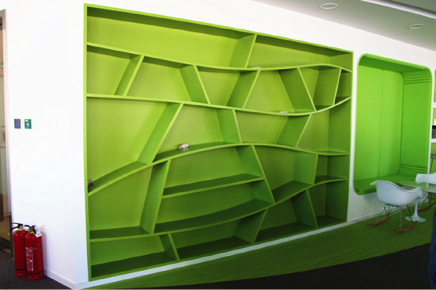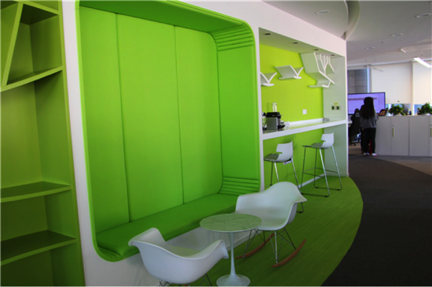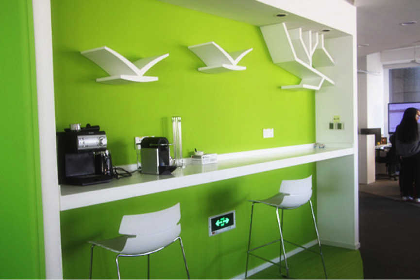 一起作業(yè)網(wǎng)6層的主題是“樹”,因而以綠白為主色調,上圖中的書架、休息區(qū)、咖啡區(qū)背景墻的顏色都是綠色,看上去賞心悅目,而且綠色有助于緩解視疲勞。在吧臺上,有咖啡機和面包機,墻上精心放置小型書架,員工可以邊看邊吃。