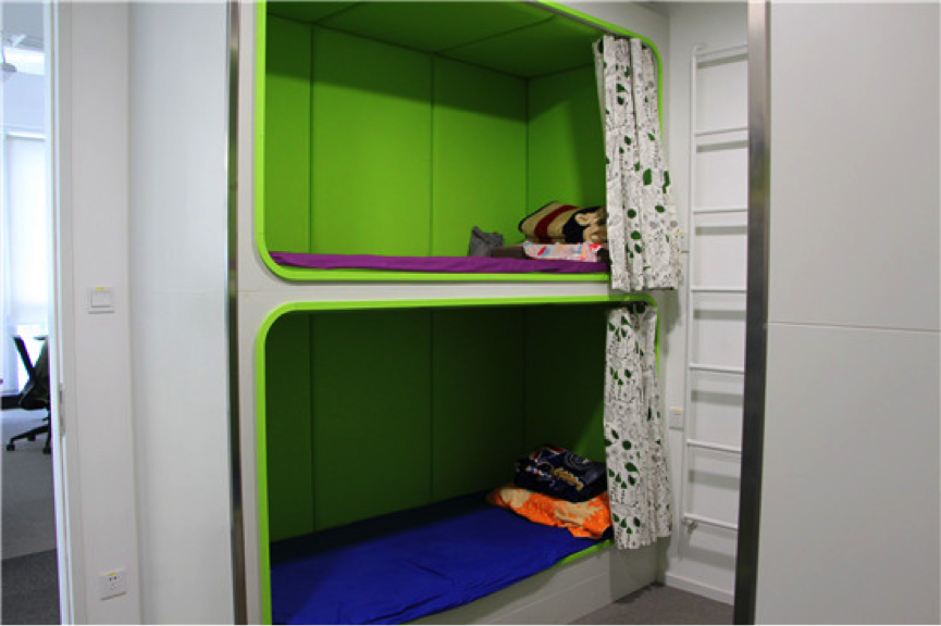 據(jù)劉孟濤介紹,一起作業(yè)網(wǎng)為加班人員準備了休息室,命名為“太空艙”,里面包括四個床位,在另一側的墻內(nèi)嵌有衣柜,用于存放衣物,每張床上都有被子和毯子,柔軟舒適。并且,清潔人員及時清理,為“微潔癖”的員工除去顧慮。