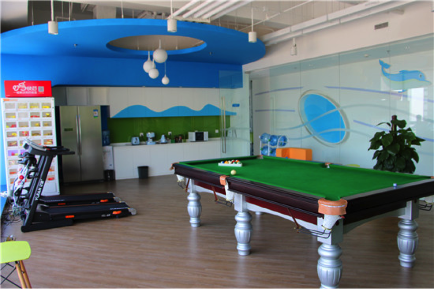 16層的飲水間和運動室結合在一起,命名為“地球”,包括臺球、跑步機,以及咖啡機、冰箱、飲料販賣機等,下午的時候,還會提供各種水果。