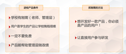 一是學校有剛需:剛需基本上是來自于兩個層面的用戶,一個層面是一線的教師,對教學這方面的剛需;另一個是管理層,學校校長或是領(lǐng)導們對教學管理方面的剛需。抓剛需的方法很簡單,首先你必須是產(chǎn)品的用戶,其次是想辦法讓直接用戶參與研發(fā)。