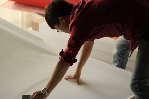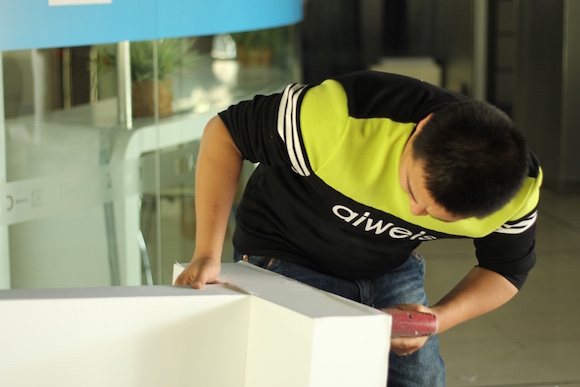 在做玻璃墻展示的同時,另一邊展板的后期工作也在緊鑼密鼓地進行,上午展板的第一層已經(jīng)粘好,還需要貼寫真(展板外部白色貼紙),這是個熟能生巧的活,兩個工作人員配合,“撕、貼、刮、剪”一氣呵成,幾分鐘后,一個白色的背板就做好了。