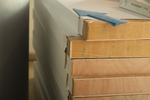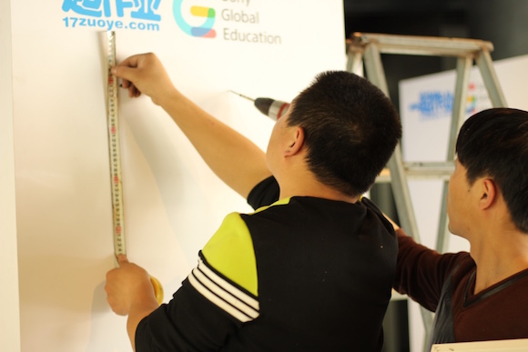 雖然有多次場地搭建的經(jīng)驗,但具體到執(zhí)行細節(jié),卻需要一次一次量距離,一點一點調整。這邊剛貼好一排畫作,正欣賞間,“這一排歪了”的評論飄過來,又只得重新開始。