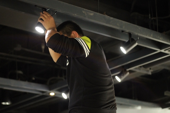 從凌晨5點到晚上5點,12個小時,搭建工作終于接近尾聲,為了畫作能夠得到更好地展現(xiàn),搭建團隊要在天花板上安裝軌道燈,每一張畫上都有一盞燈,在燈光的照射下,畫作的顏色似乎明亮起來。