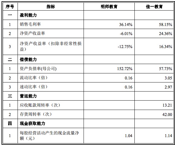 明師教育公告披露了雙方數(shù)據(jù)差距的原因:佳一教育的毛利率大幅高于明師的毛利率,主要原因是佳一教育的業(yè)務(wù)還包括圖書產(chǎn)品銷售和教學(xué)內(nèi)容服務(wù)等毛利率收入;隨著 2015 年收入的大幅增長(zhǎng),明師的毛利率也大幅提升達(dá)到 43.32%。由于明師 2014 年末的凈資產(chǎn)為負(fù),因此凈資產(chǎn)收益率低于佳一教育。由于明師的預(yù)收款項(xiàng)較多導(dǎo)致流動(dòng)負(fù)債遠(yuǎn)大于流動(dòng)資產(chǎn),資產(chǎn)負(fù)債率大幅高于佳一教育,速動(dòng)比率、流動(dòng)比率較低;通過(guò) 2015 年兩次增資后資產(chǎn)負(fù)債率(母公司)降到 57.73%,速動(dòng)比率、流動(dòng)比率都提升到 0.91。明師目前的資金主要來(lái)自于股東投資,償債能力一般。