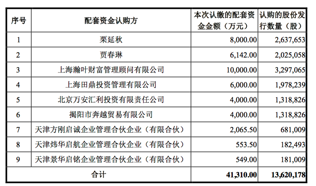 盛通股份擬向栗延秋、賈春琳、上海瀚葉財(cái)富管理顧問(wèn)有限公司、北京萬(wàn)安 匯利投資有限責(zé)任公司、上海田鼎投資管理有限公司、揭陽(yáng)市奔越貿(mào)易有限公司、天津方剛啟誠(chéng)企業(yè)管理合伙企業(yè)(有限合伙)、天津煒華啟航企業(yè)管理合伙企業(yè) (有限合伙)、天津景華啟銘企業(yè)管理合伙企業(yè)(有限合伙)非公開(kāi)發(fā)行股份募 集配套資金,總金額不超過(guò) 4.1310億元,總發(fā)行股份數(shù)量不超過(guò) 1362萬(wàn)0178 股。