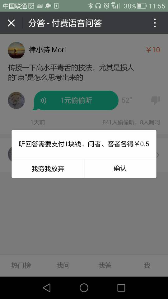 此外,回答過的問題進(jìn)入問題榜,其他用戶可以支付1元旁聽。這1元將評分給提問者跟回答者,每人各得到0.5元,看來這個設(shè)置也是在鼓勵提問者問更多有價值的問題,在這樣的機(jī)制下,問題本身受到的關(guān)注越多,提問者和回答者得到的收入也就越多。