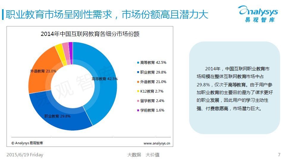 根據(jù)易觀智庫的《2015 中國互聯(lián)網(wǎng)職業(yè)教育市場專題研究報告》的報告數(shù)據(jù),在互聯(lián)網(wǎng)教育市場中占比最大的職業(yè)教育增長快速,在 2010-2014 年間的復(fù)合增長率達(dá)到 42.5%,職業(yè)教育中占比最多的又是泛 IT 教育。