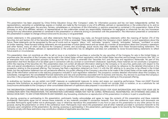 多知網(wǎng)6月6日消息,日前,51Talk發(fā)布路演PPT,之前,有關(guān)51Talk赴美IPO的基本財(cái)務(wù)信息等數(shù)據(jù)多知網(wǎng)已經(jīng)做了報(bào)道,其中存在一些如虧損嚴(yán)重、規(guī)模不經(jīng)濟(jì)的問題,那么,在這種情況下,路演要怎么講?現(xiàn)在多知網(wǎng)就帶領(lǐng)大家看一下這份路演PPT的內(nèi)容。