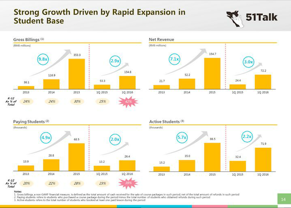 從左到右,從上到下,依次是毛收入、凈營(yíng)收、付費(fèi)學(xué)生人數(shù)、活躍學(xué)生人數(shù)在2013到2015年間的增長(zhǎng)情況。仔細(xì)看會(huì)發(fā)現(xiàn),全部是向上的發(fā)展趨勢(shì)。在橫軸下面,51Talk采用了百分比的辦法來記錄具體數(shù)字,可以看出,其K12業(yè)務(wù)增長(zhǎng)迅猛。