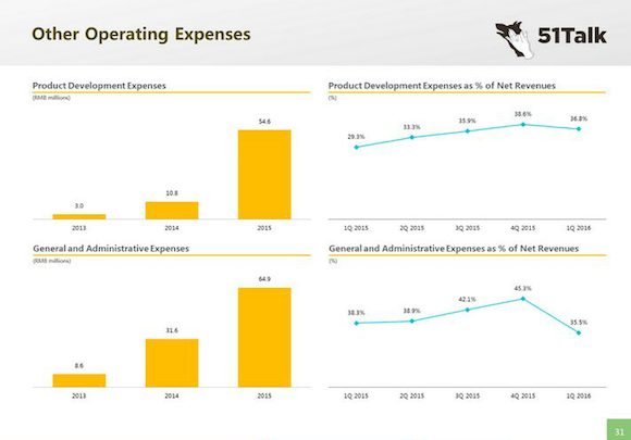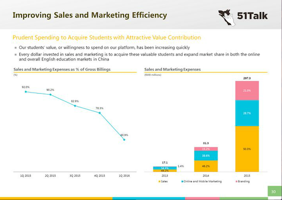 可以看出,51Talk青少業(yè)務(wù)增長(zhǎng)迅速,51Talk毛收入從2015年Q1的1310萬元增長(zhǎng)到2015年Q4的4400萬元,再到2016年的6540萬元,占當(dāng)年?duì)I收的42%。圖表顯示,K12用戶有著更高的轉(zhuǎn)介紹率,轉(zhuǎn)介紹率達(dá)到57.4%。同時(shí),每個(gè)學(xué)生的最小客單價(jià)也將變得更加貴,從2015年Q3季度的4200元漲到了2015年Q3的6200元。