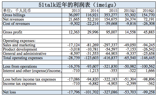 的確,2013-2015年,51Talk的凈營收分別為2166萬、5221萬、1.55億人民幣,凈虧損分別達到1780萬元、1.117億元、3.271億,其中市場營銷費用又分別高達1712萬、8126萬、2.97億,雖然營收呈現(xiàn)高增長,但營收都不夠市場營銷開支,虧損嚴重。看了這樣的業(yè)績報表,對這家公司理論上已經(jīng)沒有多大的研究興趣,但是后來看到公司的早期投資者DCM和紅杉的2000萬美元私募追加認購,不僅讓我想起了2012年唯品會的“流血”上市(當時也是DCM和紅杉保駕護航才成功IPO,后來成為大牛股),于是想花點時間看一看,而研究這個公司的聚焦點只有一個:這公司到底能不能賺錢?