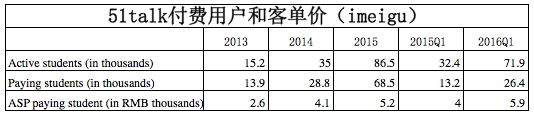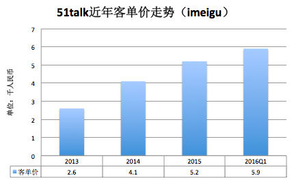 收入項( Gross billings):51Talk的課時費標準是30元人民幣/25分鐘,用戶可購買次卡(最低套餐120次)或者包月卡(最低12個月起),根據(jù)公司最新的2016年Q1數(shù)據(jù)顯示,該季度的學費收入是1.55億人民幣,付費用戶數(shù)是2.64萬,那么平均客單價即為5900元人民幣。