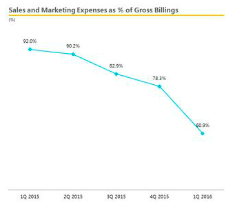 行政管理費用(類固定開支,用凈營收占比反推單客費用):主要是497名行政管理人員的開支,2016年Q1報表顯示該季度的行政管理費用/凈營收是35.54%。反推均攤到每個付費用戶,是2037塊/學員,這塊屬于相對固定成本,相信隨著招生規(guī)模和收入規(guī)模增加,生均費用會進一步下降。