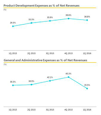 4、產(chǎn)品研發(fā)費用/當期凈收入、行政管理費用/當期凈收入在2015年的高企后,2016年Q1迎來下降拐點