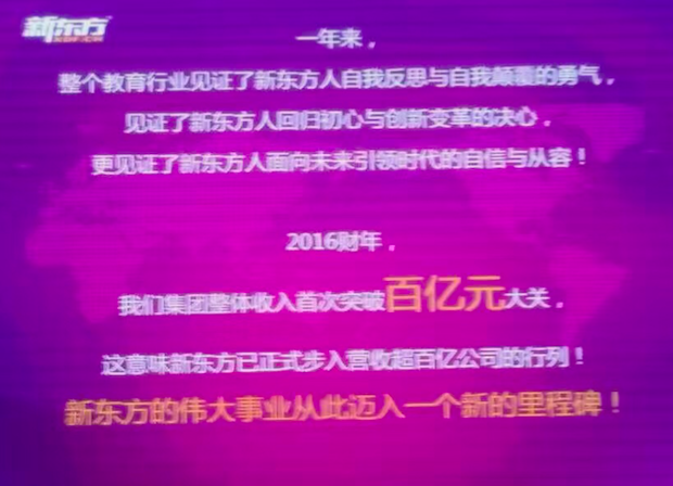 在今日的新東方2016財(cái)年總結(jié)表彰暨2017財(cái)年工作部署動(dòng)員會(huì)上,新東方官方宣布,2016財(cái)年?duì)I收破百億元。