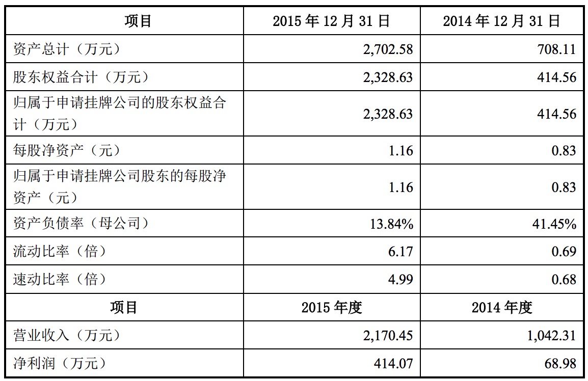 根據(jù)公開(kāi)轉(zhuǎn)讓說(shuō)明書(shū)顯示,偉才教育2014年?duì)I業(yè)收入1042.31萬(wàn)元,凈利潤(rùn)為68.98萬(wàn)元;2015年?duì)I業(yè)收入為2170.45萬(wàn)元,凈利潤(rùn)為414.07萬(wàn)元。近兩年收入狀況如下: