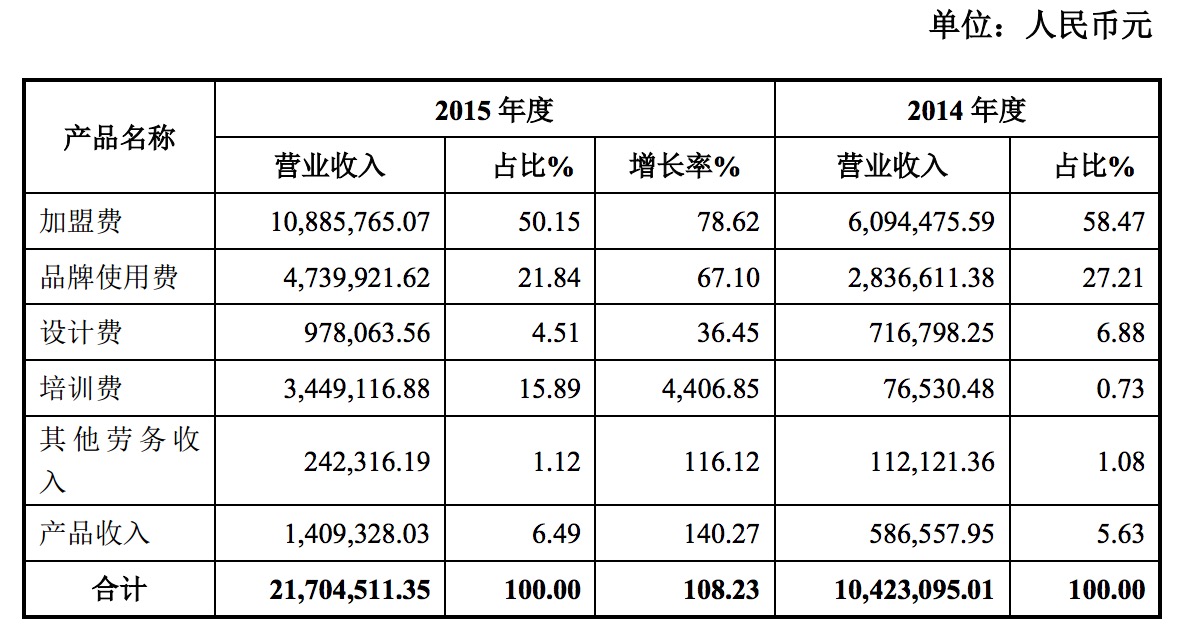 公告顯示,2015年偉才教育加盟費(fèi)為1088.5萬(wàn)元,品牌使用費(fèi)為473.9萬(wàn)元,設(shè)計(jì)費(fèi)為97.8萬(wàn)元,培訓(xùn)費(fèi)為344.9萬(wàn)元,其它勞務(wù)費(fèi)為24.2萬(wàn)元,產(chǎn)品收入為140.9萬(wàn)元。