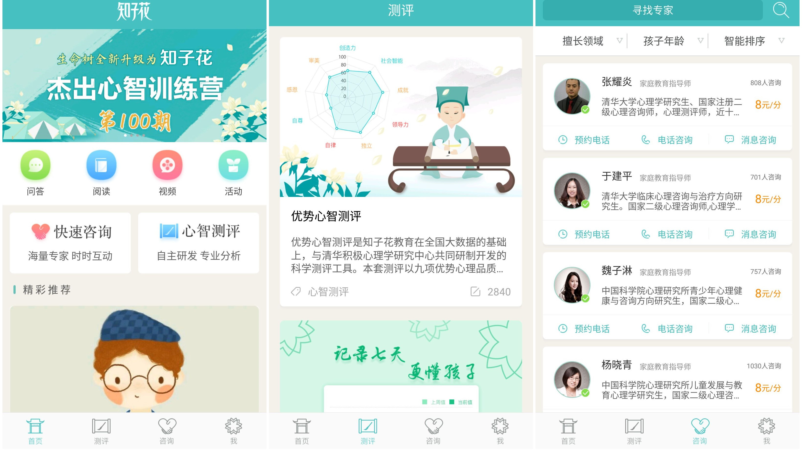 知子花APP頁面包括首頁、測評、咨詢以及我四個欄目,首頁有問答、閱讀、視頻等內(nèi)容,還有快速查詢和心智測評的選項,提供用戶使用。在咨詢欄目中,按照擅長領(lǐng)域、孩子年齡和智能排序為用戶尋找專家,用戶通過預(yù)約電話、電話咨詢、消息咨詢的方式與專家取得聯(lián)系,收費2元/分至10元/分不等,可以看到每位老師的咨詢?nèi)藬?shù)。