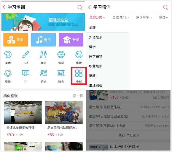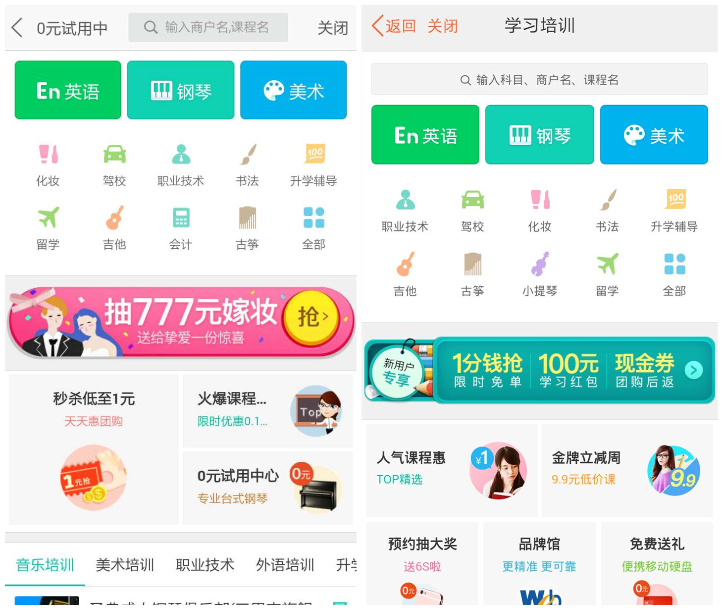 (左圖為美團(tuán)“學(xué)習(xí)培訓(xùn)”界面,右圖為大眾點(diǎn)評“學(xué)習(xí)培訓(xùn)”界面)