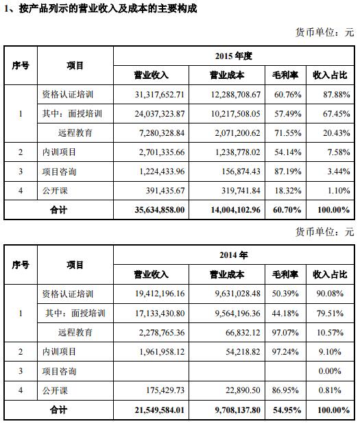 2015年度、2014年度主營業(yè)務(wù)收入占營業(yè)收入比例均為100%。主營業(yè)務(wù)收入主要來源于以PMP、軟考為主的資格認(rèn)證培訓(xùn)服務(wù)。