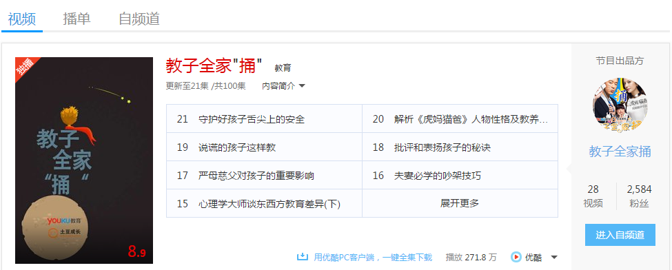 另一方面,知子花與優(yōu)酷合作,制作了家庭心理教育欄目“虎媽貓爸”,該欄目在優(yōu)酷平臺(tái)上叫做“教子全家‘捅’”。據(jù)透露,該欄目目前總播放量300多萬。