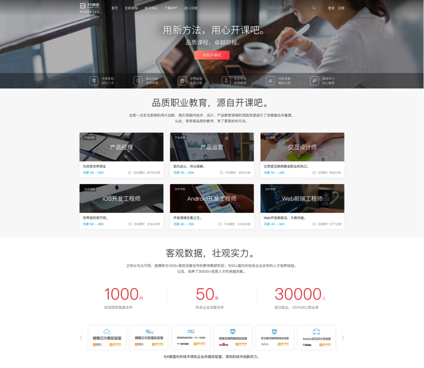 重新整合的“開課吧”,定位互聯(lián)網(wǎng)從業(yè)者技能學(xué)習(xí)社區(qū),將推出三個(gè)學(xué)院,包含產(chǎn)品學(xué)院、技術(shù)學(xué)院、設(shè)計(jì)學(xué)院;六門課程,主要包括產(chǎn)品經(jīng)理、IT技術(shù)開發(fā)、交互設(shè)計(jì)、互聯(lián)網(wǎng)新媒體營銷、產(chǎn)品運(yùn)營及創(chuàng)客培訓(xùn)等。