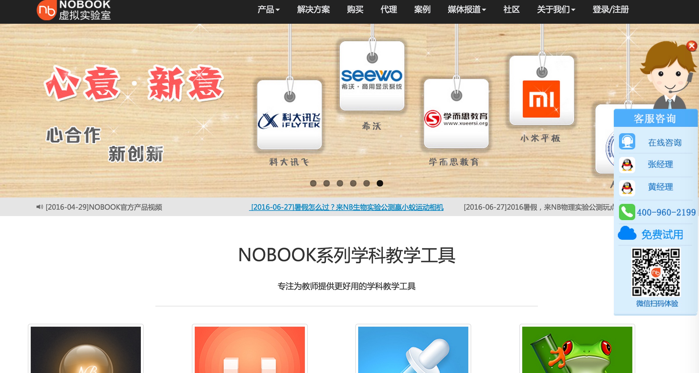 官網(wǎng)顯示,NOBOOK包括“產(chǎn)品”、“解決方案”、“購(gòu)買”、“代理”、“案例”、“媒體報(bào)道”、“社區(qū)”等八個(gè)板塊,并介紹了NOBOOK為教師提供學(xué)科教學(xué)工具,包括NB物理H5實(shí)驗(yàn)版、NB化學(xué)實(shí)驗(yàn)資源版、NB生物實(shí)驗(yàn)、NB幾何畫板等八種類型。