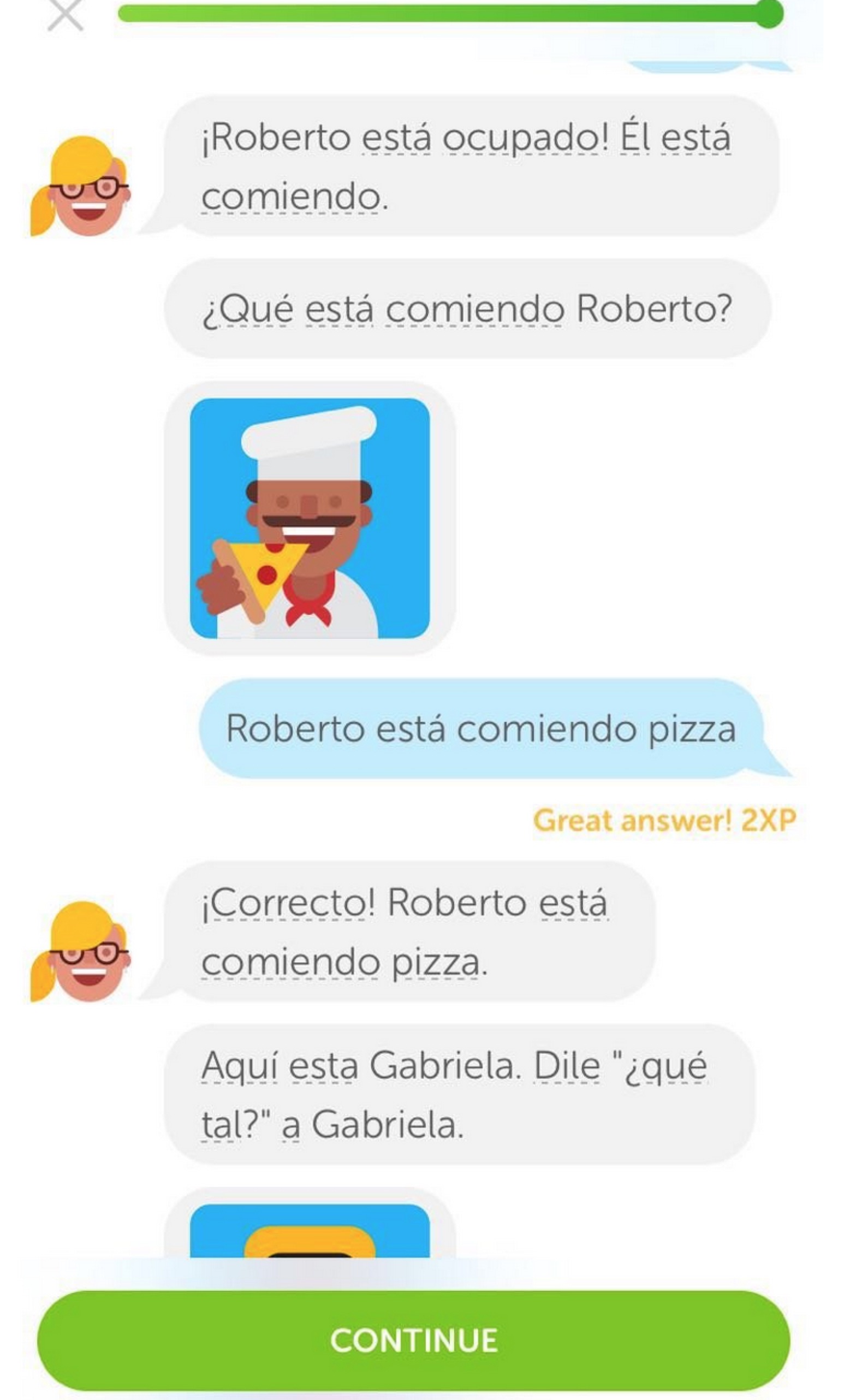 對話中,AI 會向你介紹它的朋友,比如圖片中這個(gè)人叫 Roberto。AI 就會問你:Roberto 正在干吃什么?如果你用完整的句子回答“他正在吃披薩”的話,你就會得到 2 分的獎(jiǎng)勵(lì)。如果你偷懶只回答“披薩”的話,就只能勉強(qiáng)通過,系統(tǒng)會給出一個(gè)標(biāo)準(zhǔn)的回答提示。