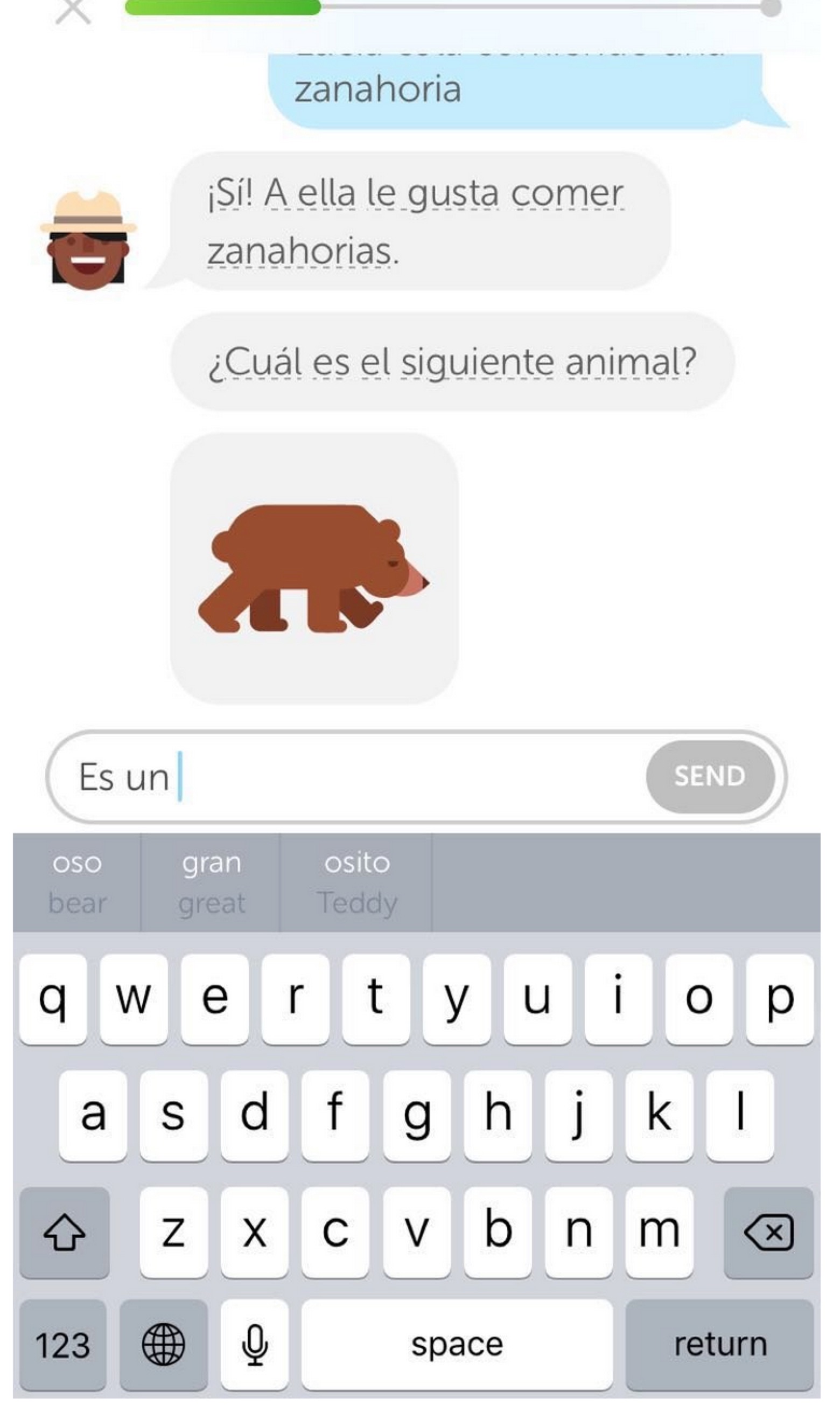 如果回答的過程中你遇到了記不住的單詞,可以向機(jī)器人求助。例如在這個(gè)對話中,AI 問你這只動(dòng)物是什么,你不知道”熊”這個(gè)單詞怎么拼的話,你就可以請求系統(tǒng)協(xié)助。