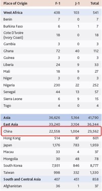 我們從上圖數(shù)據(jù)可看出,在美國就讀高中(持有F1或M1)簽證的國際學(xué)生數(shù)量為62,386人。這個國際學(xué)生的總和也比我國在美國就讀高等教育的學(xué)生少了不知道多少。(如果感興趣的話可以自行查找《門戶開放報告》中的數(shù)據(jù))那么我們看到了國際學(xué)生的總數(shù),我們中國學(xué)生到底是多少呢?