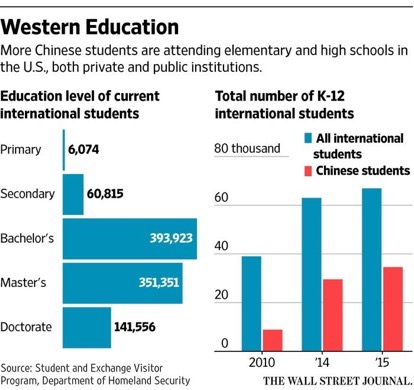 《華爾街日報》2015年12月17日發(fā)布的文章《U.S. Schools Draw More Chinese》中顯示:
