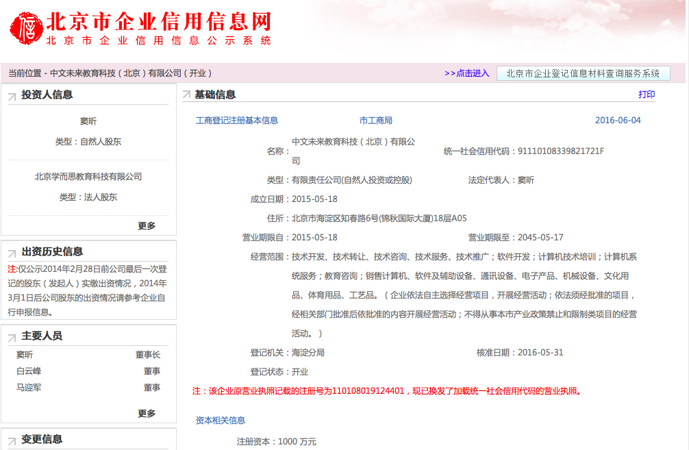 多知網(wǎng)查詢了啟迪巨人昨日發(fā)布公告中提到的諸葛學(xué)堂所屬公司中文未來教育科技(北京)有限公司工商注冊(cè)信息,以下內(nèi)容: