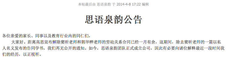 2014年2月離開高思后,在2014年4月8日,已經(jīng)成立了思語泉韻公司。