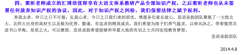 在這篇公告的結(jié)尾,思語泉韻表示,竇昕成立的匯博培優(yōu)享有持有大語文體系教研產(chǎn)品全部知識(shí)產(chǎn)權(quán),竇昕從未簽署任何放棄知識(shí)產(chǎn)權(quán)的協(xié)議。