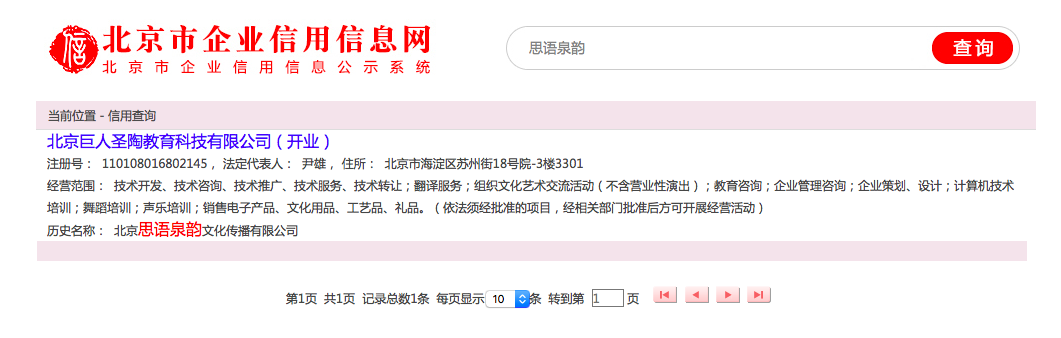 但并未查到關(guān)于匯博培優(yōu)的信息。在北京工商信息查詢思語泉韻企業(yè)相關(guān)信息后顯示:
