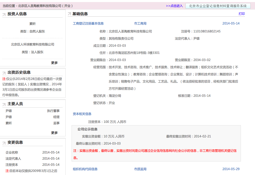 北京巨人圣陶教育科技有限公司,歷史名稱是北京思語泉韻文化傳播有限公司。成立日期是2014年3月3日,法定代表人是尹雄。投資人為竇昕(自然人股東)、北京巨人環(huán)球教育科技有限公司(法人股東)。注冊(cè)資本100萬元,雙方分別出資16.3萬元、87.3萬元。