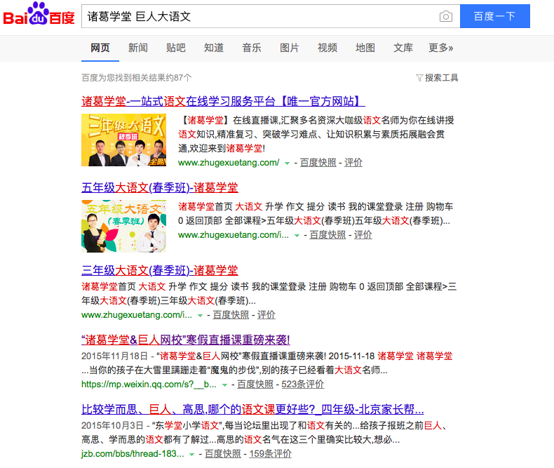 圖為百度搜索“諸葛學(xué)堂、百度大語文”顯示的結(jié)果