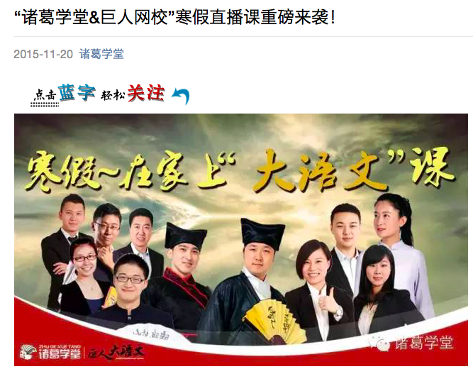 圖為2015年11月,諸葛學(xué)堂、巨人網(wǎng)校合作的是寒假“大語文”課,圖中老師包括了趙伯奇、高志合等
