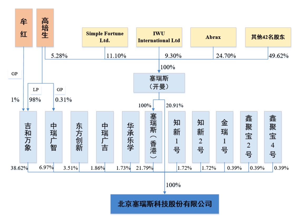 報(bào)告披露, 塞瑞斯12名股東股權(quán)較為分散,除吉和萬(wàn)象持股權(quán)比例為38.62%外,其他單一股東持股均未超過(guò)25%。吉和萬(wàn)象的持股比例構(gòu)成相對(duì)控股,為塞瑞斯的控股股東。報(bào)告稱(chēng),2015年10月,高培生通過(guò)股權(quán)轉(zhuǎn)讓及增資成為塞瑞斯實(shí)際控制人,牟紅與高培生系夫妻關(guān)系,因此,高培生和牟紅為公司的共同實(shí)際控制人。