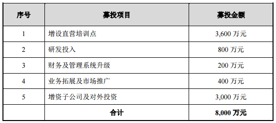 公告顯示,本次募集資金將用于佳一教育增設(shè)30家直營培訓(xùn)點(diǎn)、研發(fā)投入、財(cái)務(wù)及管理系統(tǒng)升級(jí)、業(yè)務(wù)拓展及市場推廣、增資子公司及對(duì)外投資。