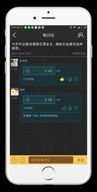 教師還可以通過曉黑板將調(diào)查問卷分別發(fā)送給每個家長,從而即保護(hù)了個人隱私,又能獲得學(xué)生反饋的有效信息。此外,教師也可以發(fā)起討論,討論的主題由教師決定,比如發(fā)布朗讀、背誦作業(yè)等,學(xué)生可以通過語音和文字的形式參與討論。