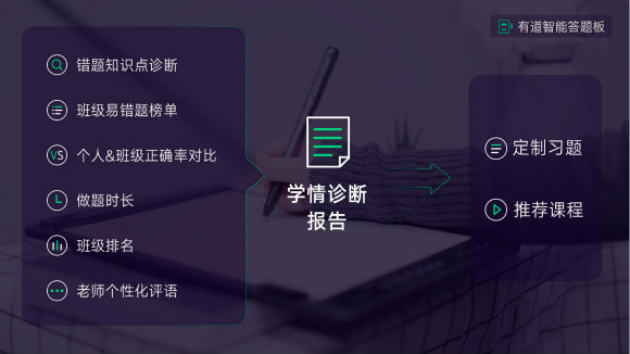 智能答題板還可以收集用戶數(shù)據(jù)并進(jìn)行匯總,有道精品課的人工智能系統(tǒng)就會(huì)對(duì)每個(gè)學(xué)生的情況進(jìn)行分析,并出具一份『學(xué)情診斷報(bào)告』。在這份報(bào)告里,學(xué)生能看到自己的錯(cuò)題診斷、做題時(shí)長(zhǎng)、班級(jí)排名及老師個(gè)性化評(píng)語(yǔ)等內(nèi)容。