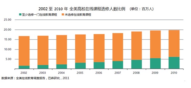正如《慕課雜談》前幾期所談到的,慕課并不是一個完全嶄新的概念,就美國而言,伴隨著20世紀(jì)末開始的營利性教育公司上市大潮,商業(yè)在線教育服務(wù)也應(yīng)運而生,無奈學(xué)生準(zhǔn)入門欄、課程質(zhì)量控制、學(xué)費貸款及就業(yè)前景等諸多因素影響,公眾似乎對在線教育產(chǎn)品并不買賬。伴隨著信息技術(shù)迅猛前行,在線教育也得到了進一步發(fā)展,人們對于線上課程的態(tài)度也不像過去那樣冷若冰霜,根據(jù)巴森研究2011年發(fā)表的一份調(diào)查報告顯示,2003年,只有10%的大學(xué)生選修過在線課程,而短短七年后,這一數(shù)字增長了約兩倍,截至2010年秋季學(xué)期,全美高校近三成學(xué)生選修了至少一門在線課程,加之近年來哈佛、麻省理工等名校對在線項目投入的不斷增加,陸續(xù)推出了一系列深受好評的慕課產(chǎn)品,某種意義上講,名校戰(zhàn)團的加入也為在線教育這一飽受爭議的教學(xué)模式增加了權(quán)威背書,這也無疑會為在線教育推廣帶來更多利好。