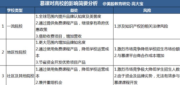 對于活躍在慕課圈的一流名校而言,慕課帶來的收益無疑是巨大的,它不僅有助于名校們在全球范圍內(nèi)多快好省的推廣自身品牌,同時也將助其得到更多公益基金的垂青。長期來講,隨著慕課商業(yè)模式逐漸清晰,收費課程項目與相關(guān)產(chǎn)品的推出勢必會為校方帶來更多的經(jīng)濟利益。而短期來看,免費慕課項目的推出也可以緩和校方與公眾的緊張關(guān)系,對“名牌大學(xué)不履行應(yīng)盡社會責(zé)任”的質(zhì)疑聲音進行有力應(yīng)對,這一舉措對美國高校繼續(xù)享受原本飽受爭議的免稅資格也是極為有利的。就名校慕課戰(zhàn)略而言,個人實在是想不出有什么瑕疵(詳情請參見《慕課雜談》系列中第三、四篇文章:《Edx如何商業(yè)化》與《Edx所提供的兩種商業(yè)模式》),如果談到風(fēng)險,由于這類院校通常選擇自主開發(fā)平臺,校方可能將會面臨涉及課程教師、課程院校及相應(yīng)技術(shù)提供商等多方面的知識產(chǎn)權(quán)法律糾紛,關(guān)于這點,我將會在后續(xù)的文章中做個簡要分析。