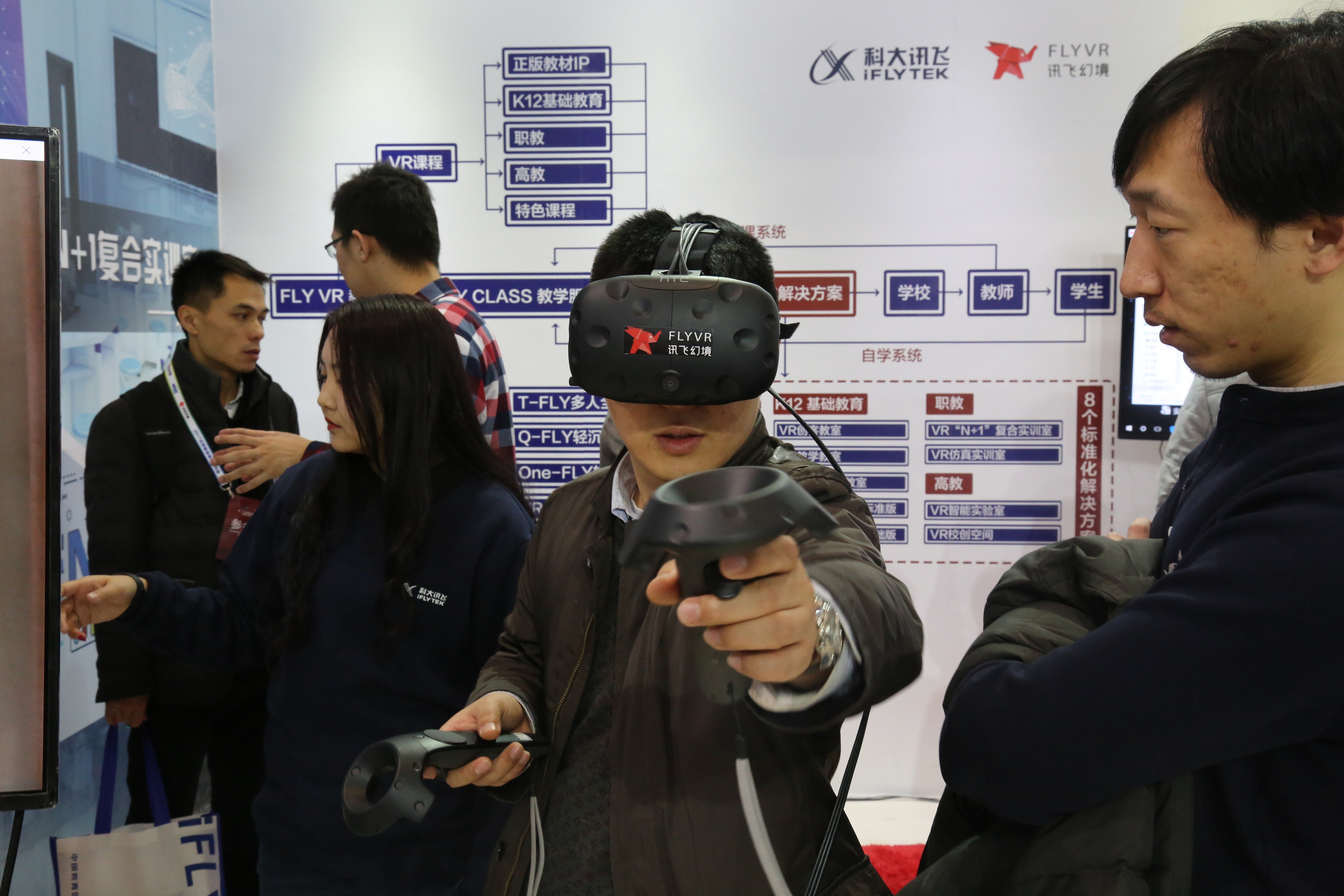 (北京裝備展會(huì)上參觀者現(xiàn)場(chǎng)體驗(yàn)訊飛幻境VR內(nèi)容)